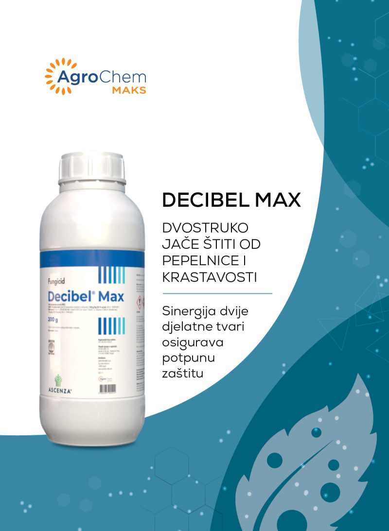 DECIBEL MAX® je potpuno novi fungicid u programu zaštite masline od paunovog oka u Hrvatskoj. Inovativna kombinacija dvije djelatne tvari u pripravku DECIBEL MAX, posebno je prilagođena za zaštitu masline od paunovog oka. Kresoksim-metil ometa klijanje spora i razvoj micelija dok difenokonazol djeluje unutar biljke djelujući dubinski protiv uzročnika bolesti. DECIBEL MAX® je najbolje rješenje za suzbijanje paunovog oka na područjima gdje se pojavila otpornost na tradicionalne fungicide koji su do sada korišteni u zaštiti. Prednosti korištenja novog pripravka DECIBEL MAX su višestruke. Ova je kombinacija dvije djelatne tvari po prvi put registrirana u maslinarstvu u Hrvatskoj. DECIBEL MAX izuzetno je otporan na ispiranje kišom i ima dugo sistemično djelovanje. Kombinacija dviju djelatnih tvari osigurava preventivno i kurativno djelovanje na paunovo oko. DECIBEL MAX ne ostavlja nikakvih ostataka u ulju.
