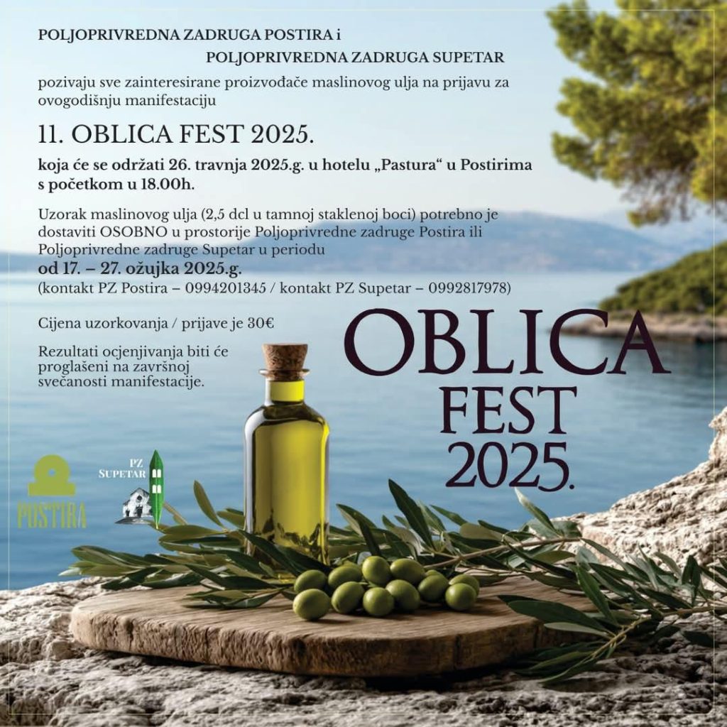 Sa ciljem utvrđivanja kvalitete maslinovog ulja i nagrađivanja proizvođača najboljih maslinovih ulja, PZ Postira i Supetar pozivaju proizvođače maslinovog ulja s otoka Brača i okolice na dostavu uzoraka prošlogodišnjeg maslinovog ulja.