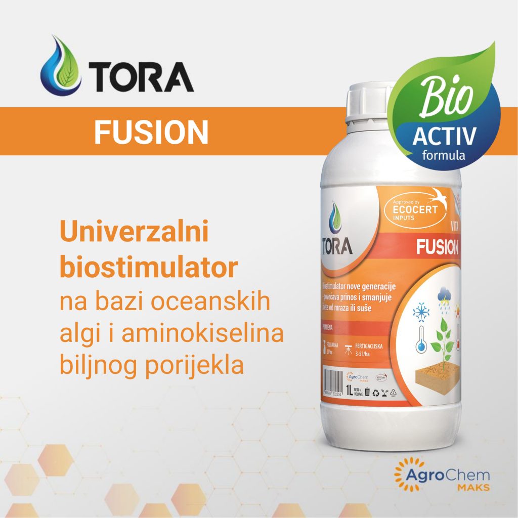 TORA FUSION univerzalni je biostimulator na bazi oceanskih algi i aminokiselina biljnog porijekla dozvoljen u svim tipovima poljoprivredne proizvodnje (ekološka i konvencionalna, odnosno integrirana proizvodnja). TORA FUSION aminokiseline dobivene su enzimatskom hidrolizom. Naime, aminokiseline sadržane u biostimulatorima mogu biti dobivene (ekstrahirane) iz sirovine na dva načina: enzimatska hidroliza i hidroliza upotrebom kiseline. Enzimatska hidroliza preferira se pri ekstrakciji aminokiselina iz sirovina zbog svoje selektivnosti, blagih uvjeta obrade te očuvanja biološke aktivnosti, što rezultira aminokiselinama visoke čistoće i biološke aktivnosti koje su učinkovitije za poticanje rasta i razvoja biljaka.